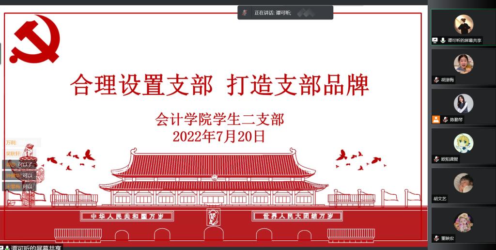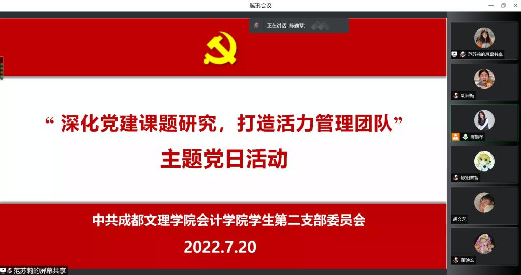 2022年7月20日晚上8时30分,会计学院学生二支部在腾讯会议开展“深化党建课题研究、打造活力管理团队”主题党日活动。会计学院学生二支部全体师生党员参与此次活动,活动由陈琴主持。