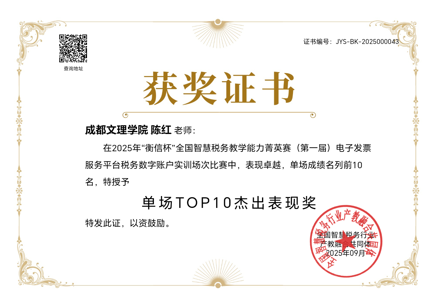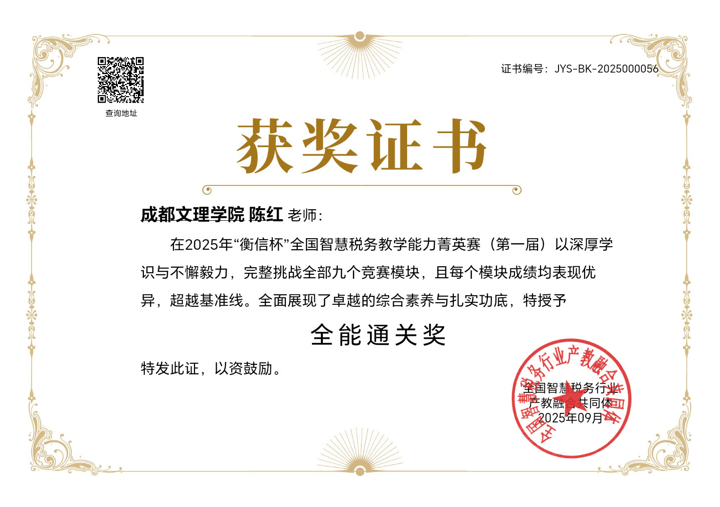 近日,这项高水平的专业赛事圆满落幕。竞赛吸引了来自全国200余所院校的近400位教师同台竞技,经过激烈角逐,我校会计学院陈红老师凭借扎实的专业功底脱颖而出,取得个人总分一等奖、全能通关奖、团体总分三等奖的优异成绩。