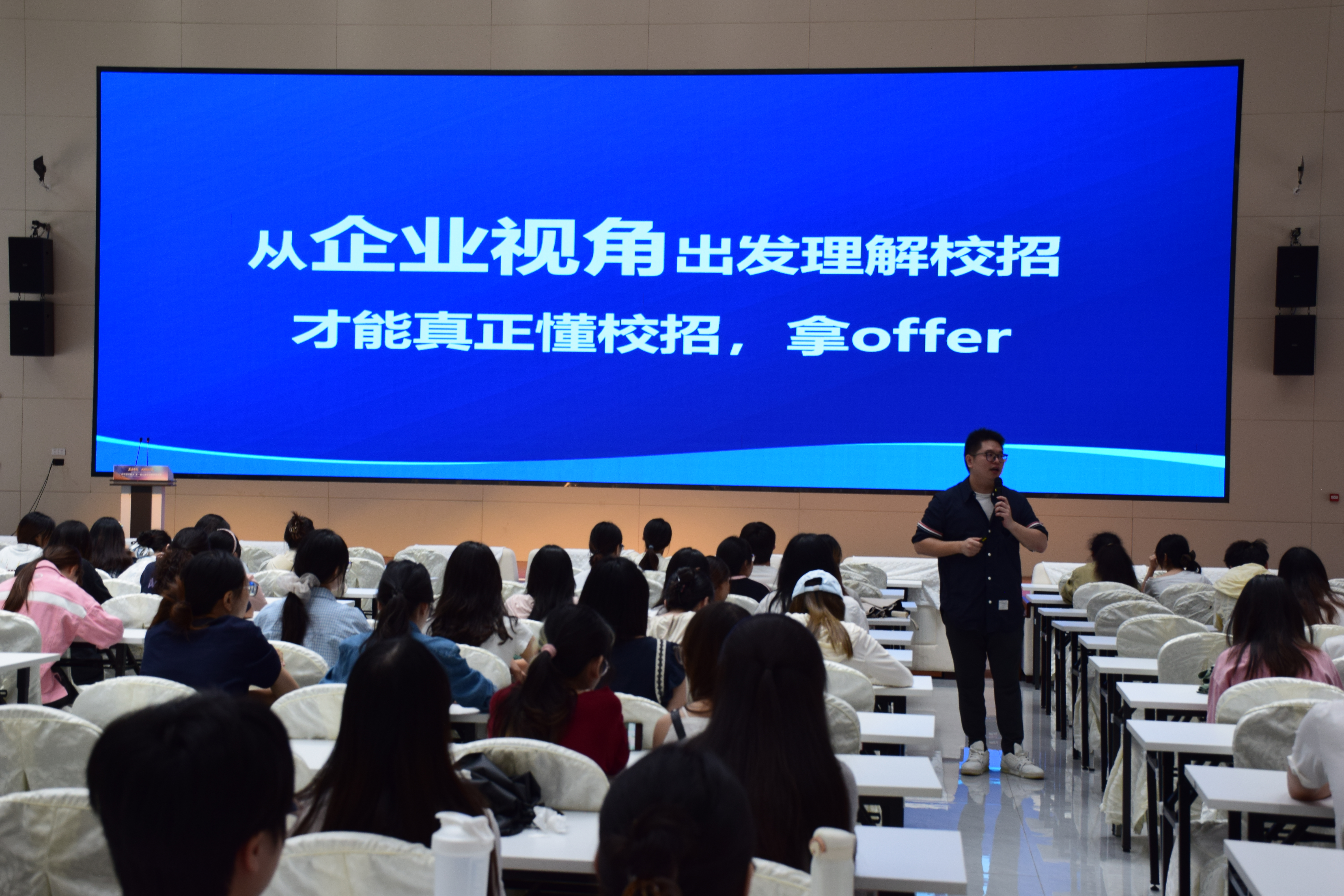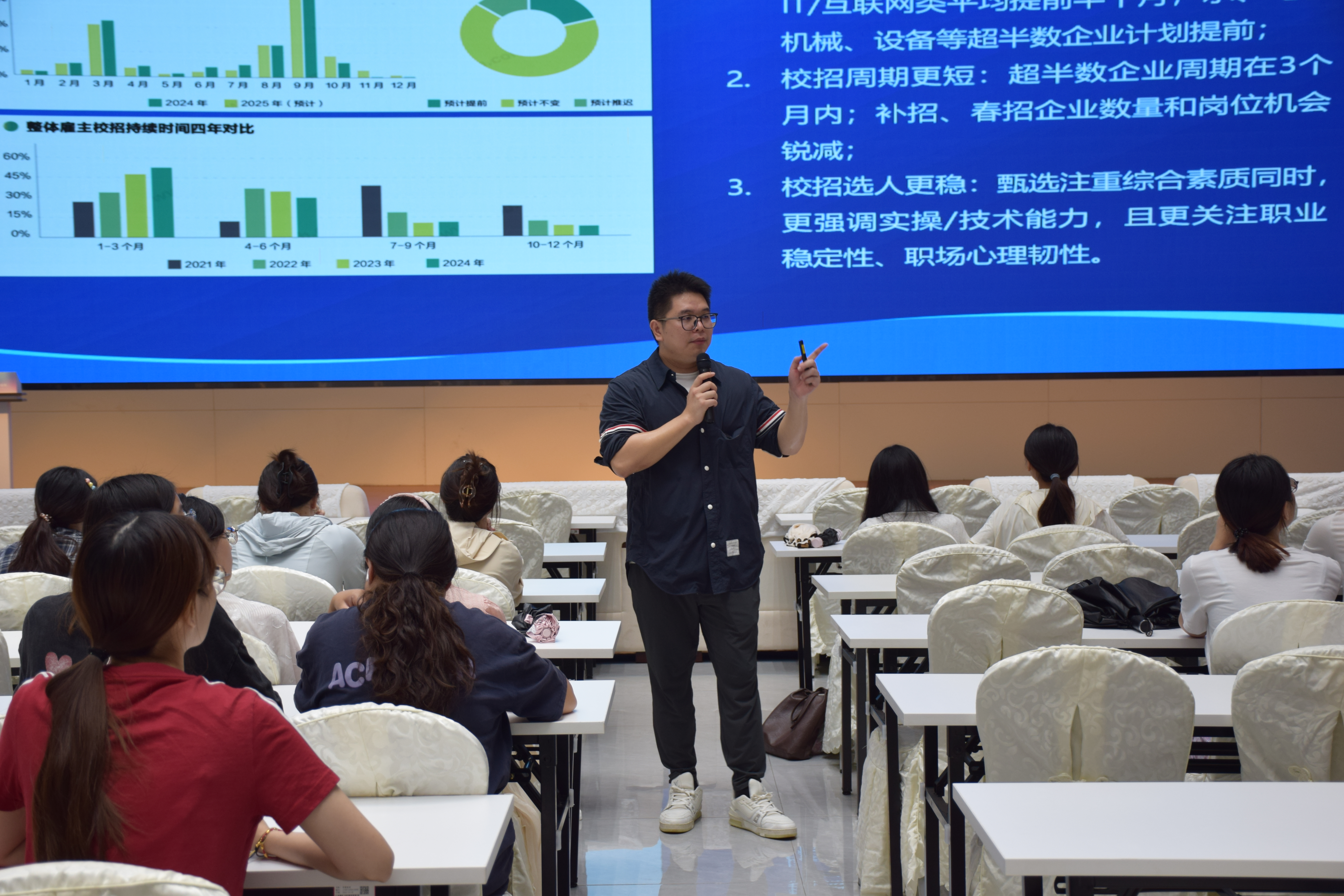 讲座伊始,翁林笙先生以几个尖锐的问题引发了同学们的深思:“今年找工作更容易还是更难?”“已经开始投递的同学感受如何?”他指出,2026年全国高校毕业生人数预计将达1593万,再创历史新高,而企业受宏观环境影响,普遍采取“降本增效”、“由攻转守”的策略,导致校招Offer率自2021年以来持续在50%左右低位徘徊,求职形势严峻。在此背景下,企业校招呈现出“启动更早、周期更短、选人更稳”的特点,而学生的求职选择也愈发趋向“求稳”,国企、机关、事业单位成为热门选择。