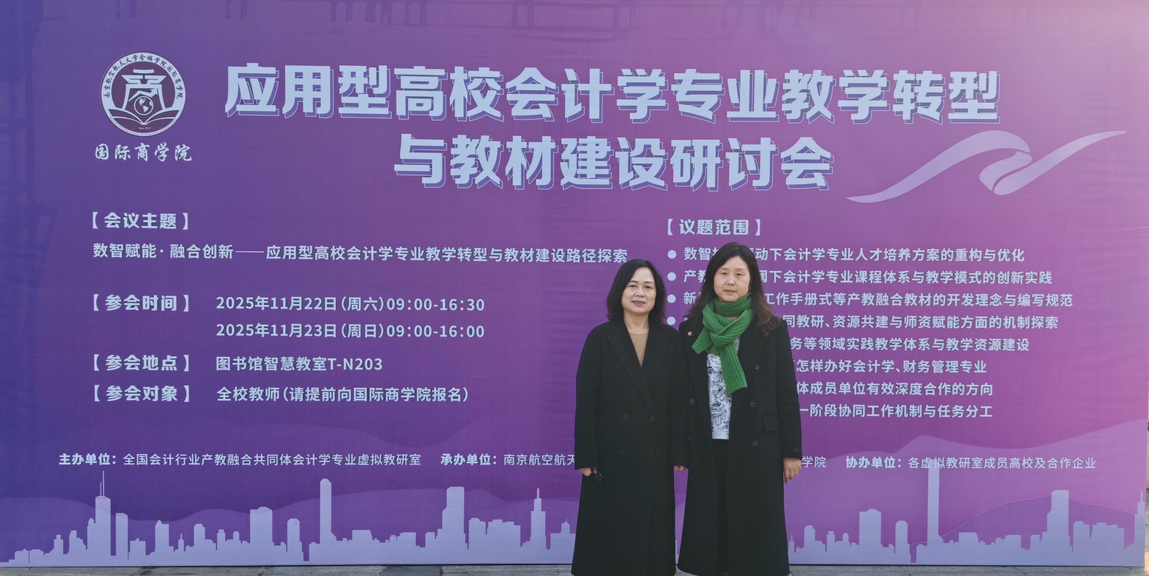 2025年11月22日至23日,会计学院院长助理刘春华与专职教师刘燕赴南京参加由全国会计行业产教融合共同体、会计学专业虚拟教研室主办的“应用型高校会计学专业教学转型及其教材建设研讨会”。本次会议在南京航空航天大学金城学院举行,来自全国多所高校的专家学者齐聚一堂,共同探讨会计学专业教学转型与教材建设的前沿议题。