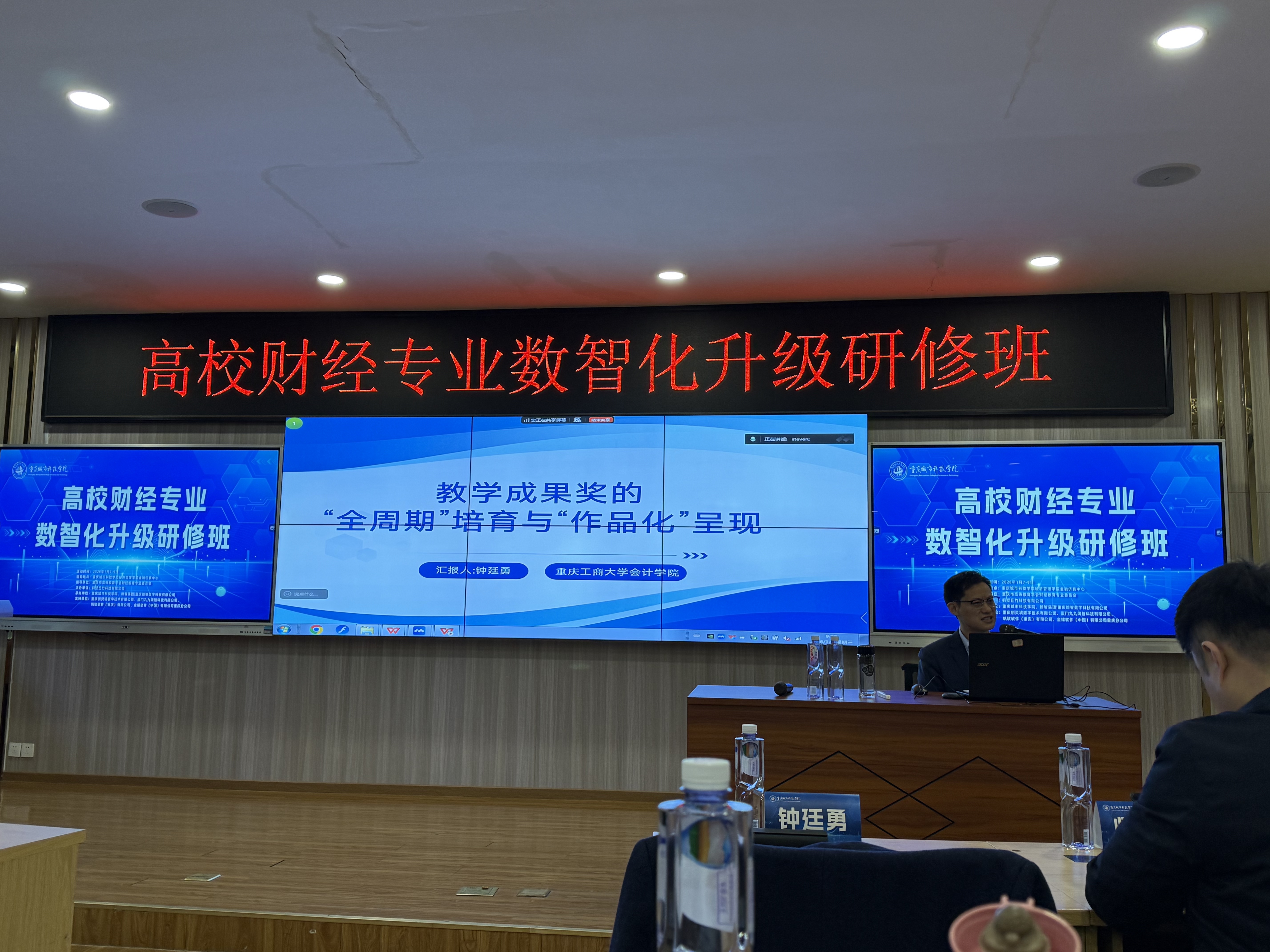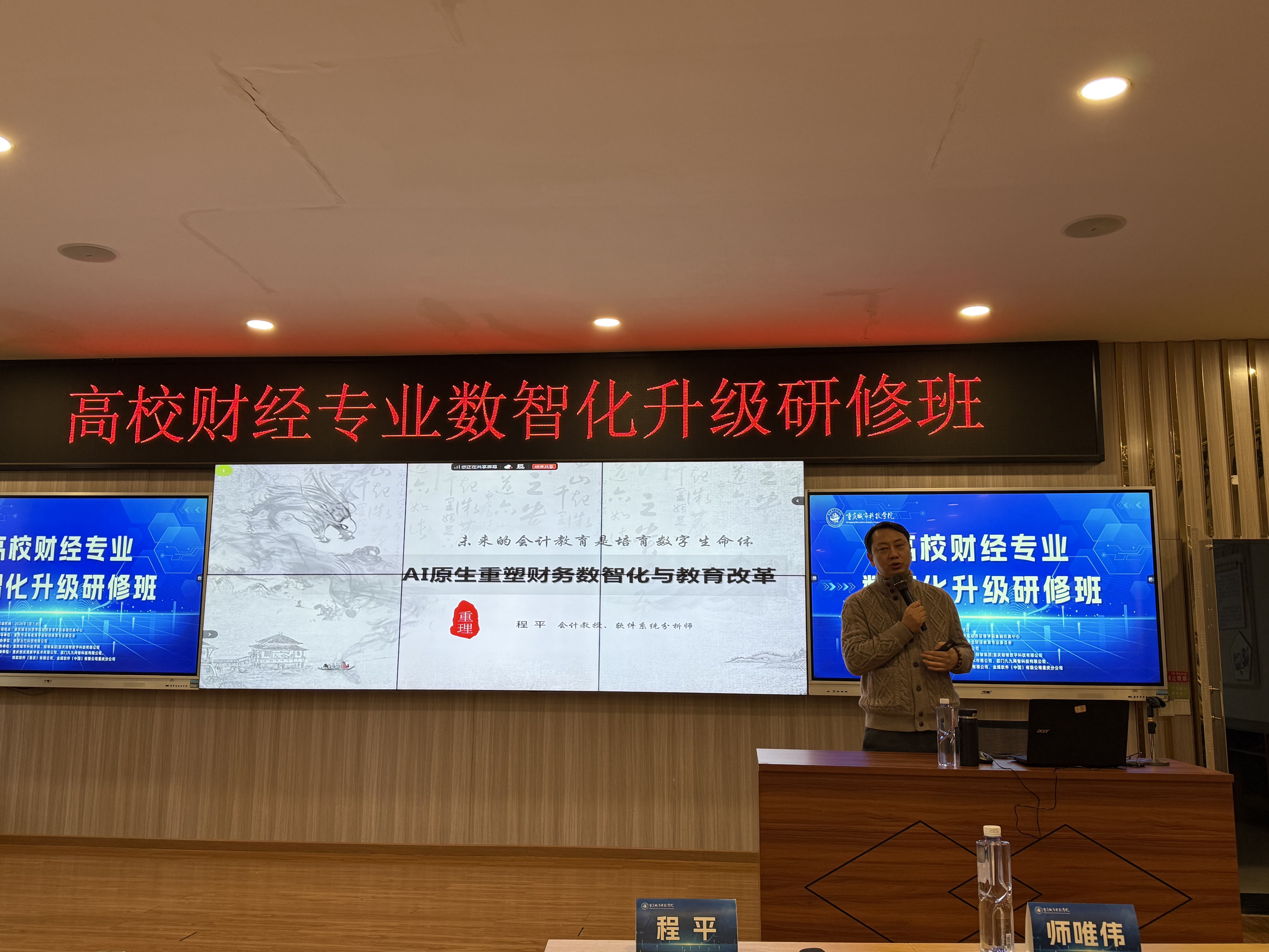 为深入探讨数智技术与教育教学的深度融合,加速财经专业人才培养模式的创新转型,2026年1月7日至9日,会计学院会计学教研室副主任杨爱香、审计学教研室专职教师周扬帆、大数据财会教研室专职教师贺宇赴重庆城市科技学院参加了“高校财经专业数智化升级研修班”。本次研修班为期三天,内容涵盖了行业前沿趋势解读、专业建设路径规划及教学工具实教应用等多个维度,旨在通过系统化的课程设置,助力教师掌握数智化时代财经教育的核心竞争力。