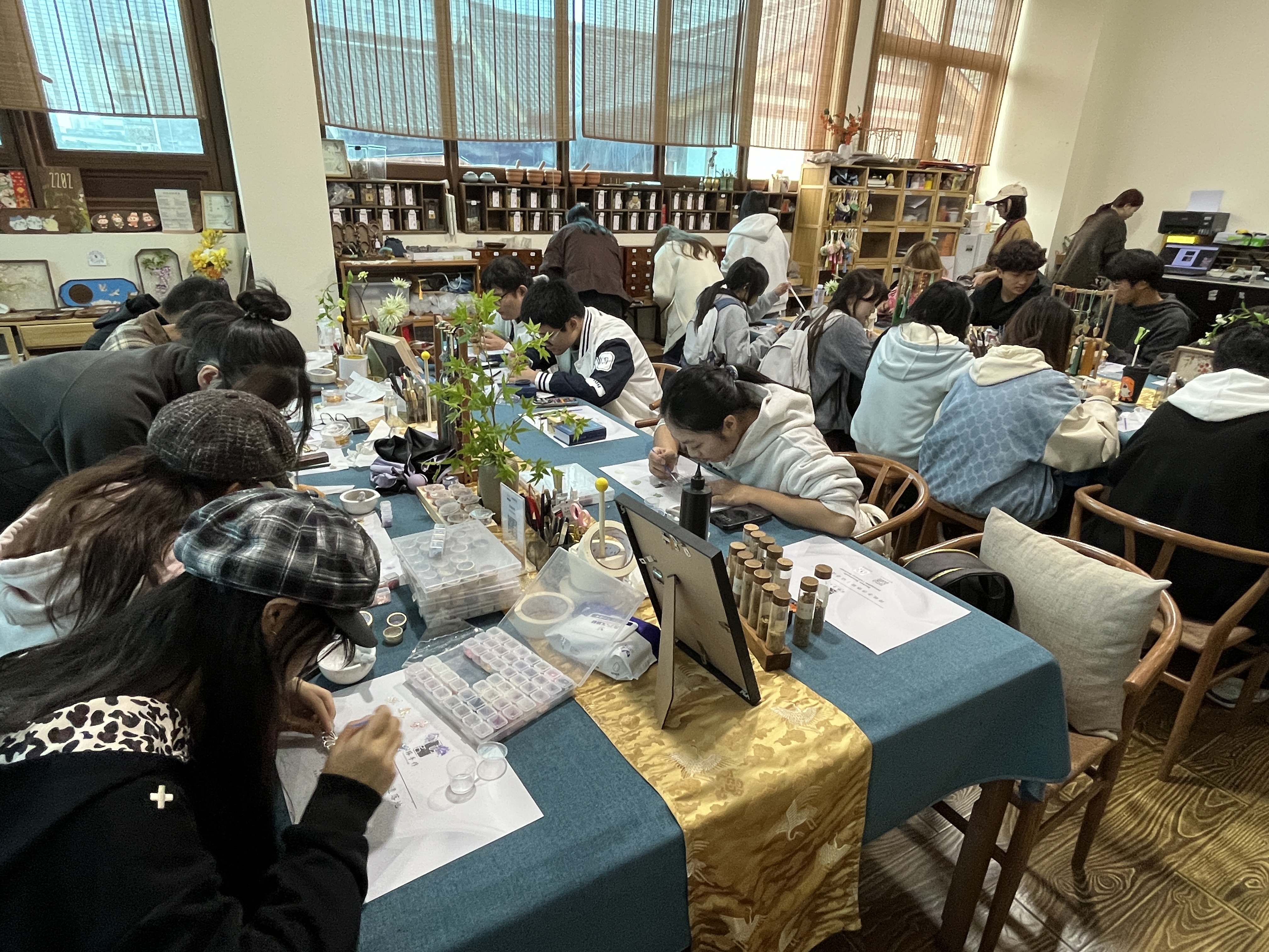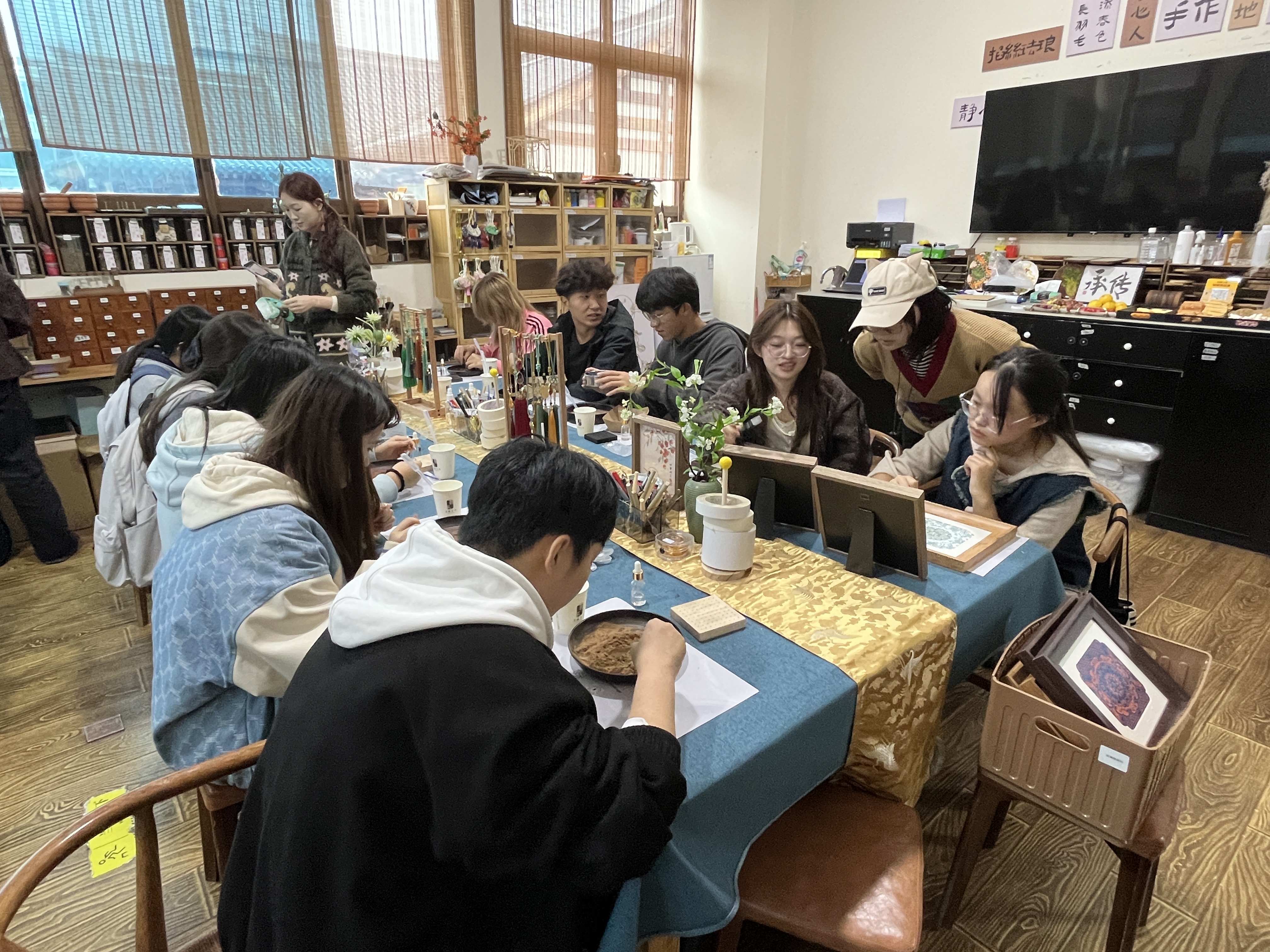下午1时,非遗手作体验正式开启。同学们在非遗导师的指导下,分组体验了多项传统手工艺项目:螺钿、古法合香、香囊制作、篆刻、掐丝黑檀木镇尺、宋锦珍珠画。与常规体验不同,本次手作活动特别安排了非遗传承老师进行一对一的教学指导与辅助操作。在老师们耐心细致地讲解下,同学们不仅了解了每项技艺的历史源流与文化内涵,更在每一个关键步骤上得到了手把手地传授。无论是螺钿的精细拼贴、合香的和香与成型,还是篆刻的运刀技巧、掐丝珐琅的勾勒点蓝,老师们都倾囊相授,确保每位同学都能克服难点,深刻体会传统手工艺的匠心独运与精益求精。这种深度的互动教学,让同学们得以真正沉静下来,完成了一件件充满个人特色与温度的作品。