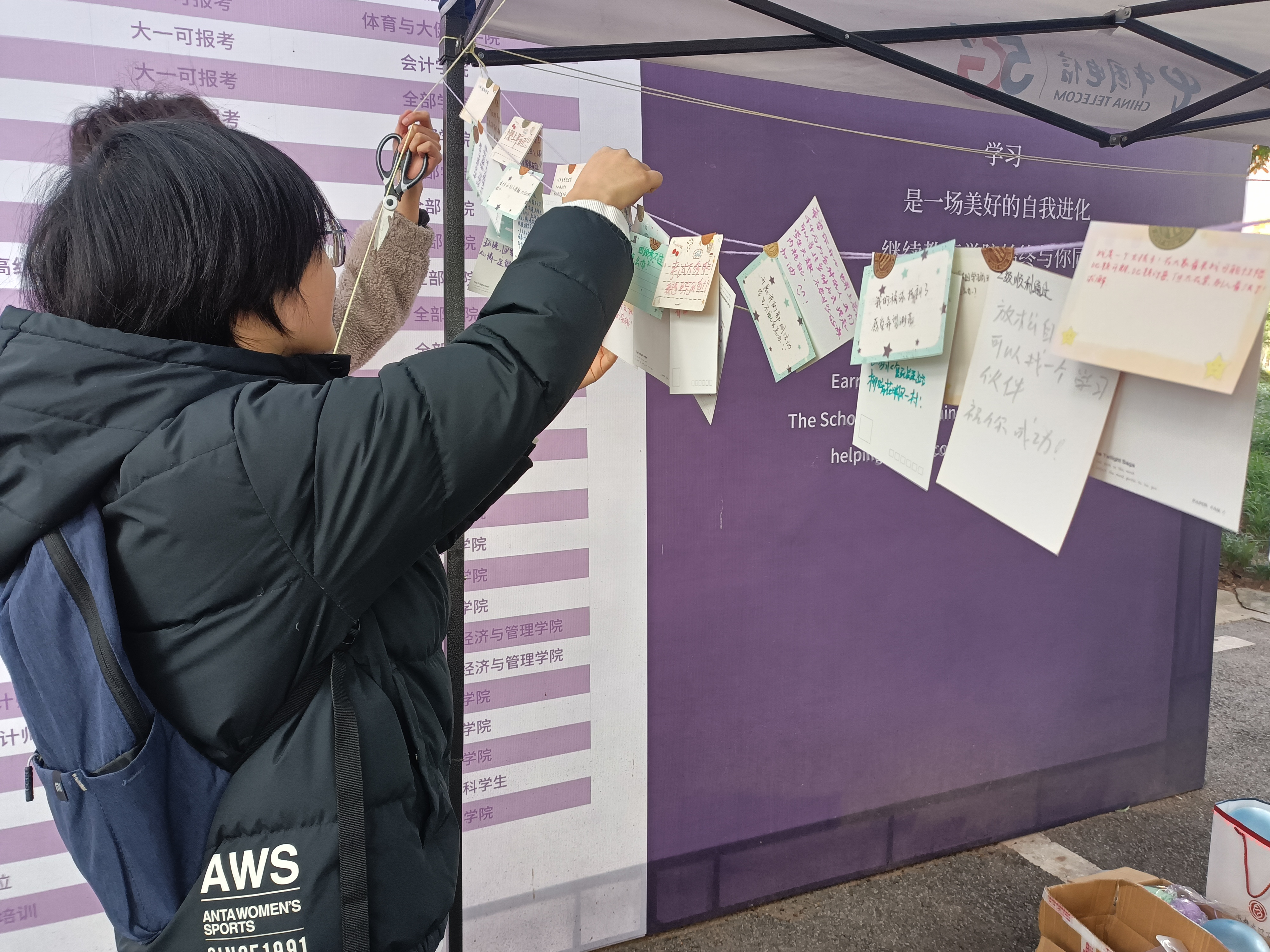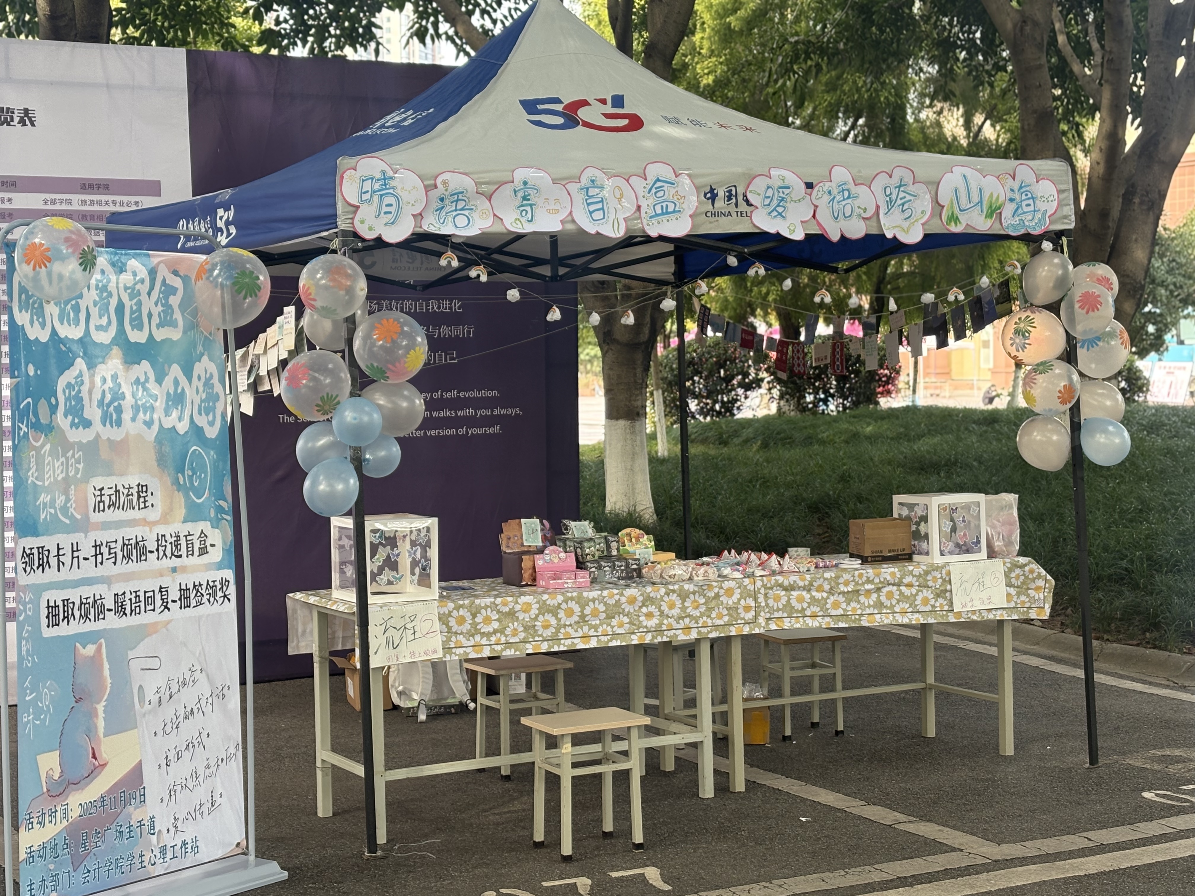 为有效疏解学生的学业压力与生活焦虑,积极传递朋辈心理关怀的正向力量,2025年11月19日—20日,会计学院学生心理工作站于星空广场主干道开展了“晴语寄盲盒,暖语跨山海”心理主题体验活动。本次活动面向全校学生开放,以“匿名倾诉”与“暖心回应”相结合的创新盲盒形式,为学子们构建了一个安全、温暖的倾诉空间,引导大家在文字中释放情绪,于陌生同窗的拳拳善意里收获慰藉,成为秋日校园中一道温暖人心的独特风景。