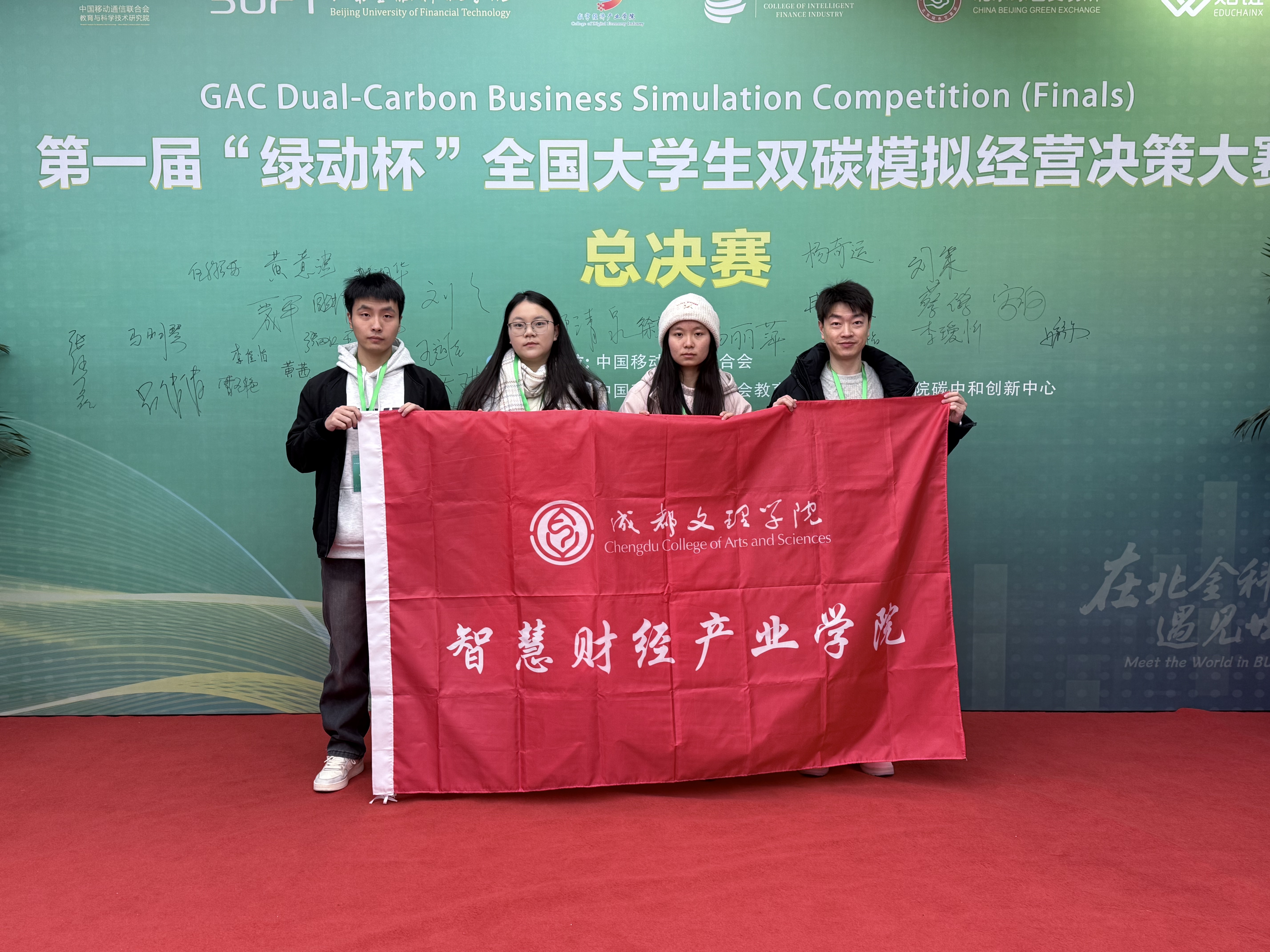 近日,第一届“绿动杯”全国大学生双碳模拟经营决策大赛总决赛在北京圆满落幕。本次比赛由中国移动通信联合会指导,中国移动通信联合会教育与科学技术研究院碳中和创新中心主办,北京金融科技学院承办,全国15所高校学生队伍晋级全国总决赛。在成都文理学院智慧财经产业学院的支持下,我校会计学院教师刘春华、许新亮带领3名同学组成的参赛团队,凭借扎实的专业功底、出色的团队协作与创新的经营决策,晋级全国总决赛并荣获优胜奖。